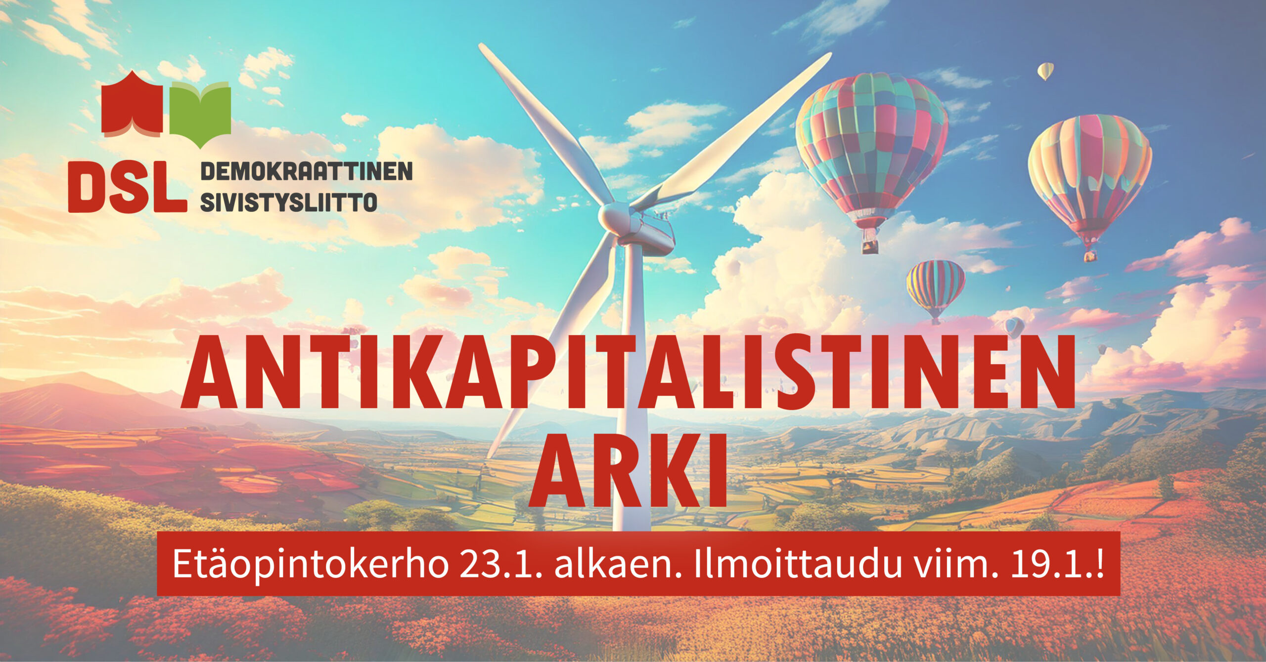 Banneri etäopintokerholle nimeltä 'Antikapitalistinen arki'. Kuvassa näkyy sinisellä taivaalla kuumailmapalloja ja taustalla tuulivoimala, joka seisoo vehreän maiseman keskellä. Taivaan sävy on vaaleanpunainen ja keltainen, viitaten auringonlaskuun tai nousuun. Julisteen yläosassa on DSL:n logo. Keskellä suurin kirjaimin punaisella lukee 'ANTIKAPITALISTINEN ARKI'. Alareunassa on lisätieto punaisella pohjalla: 'Etäopintokerho 23.1. alkaen. Ilmoittaudu viim. 19.1.!'.