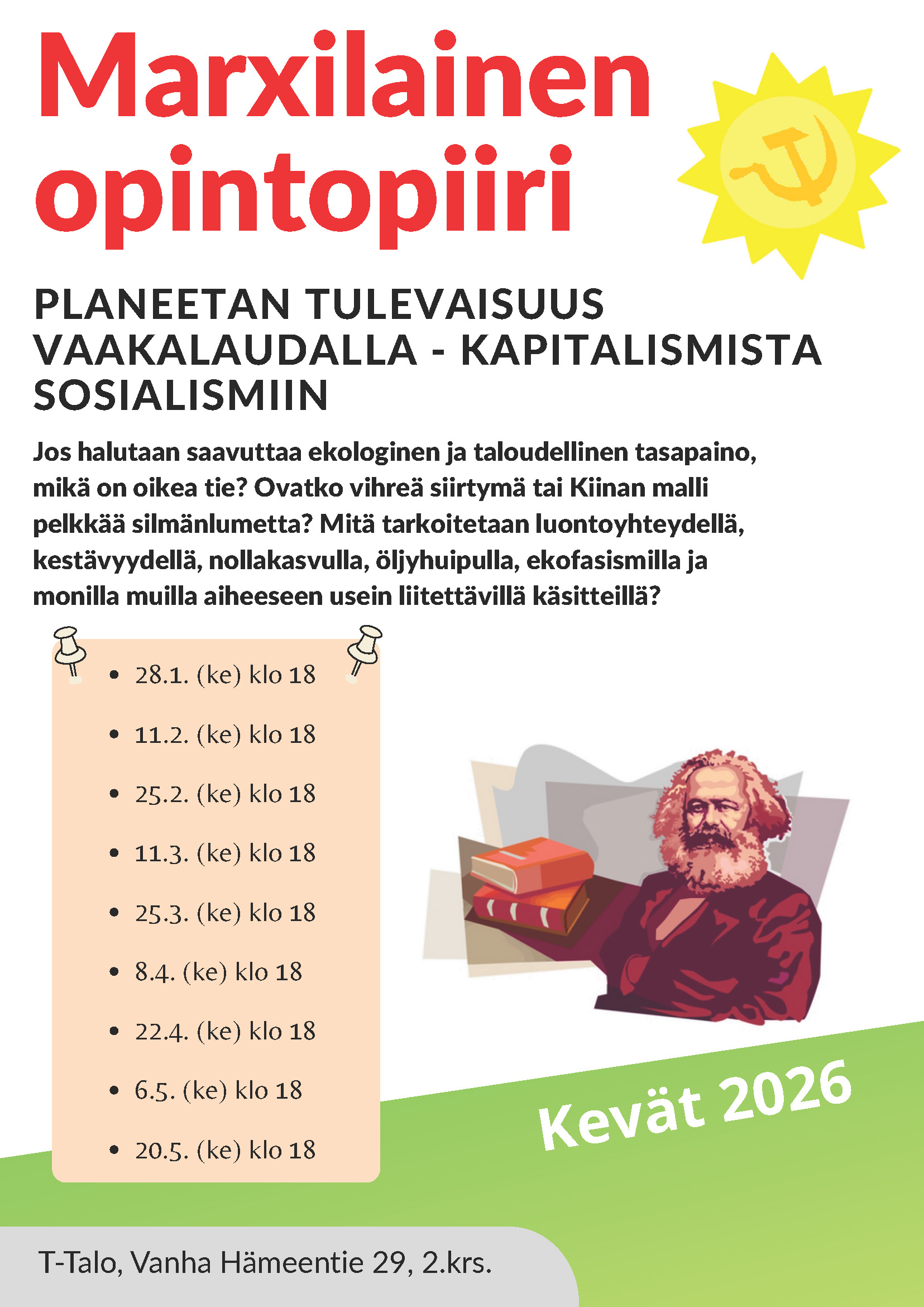 Juliste Marxilaisesta opintopiiristä keväällä 2026. Otsikkona ”Marxilainen opintopiiri” ja alaotsikkona ”Planeetan tulevaisuus vaakalaudalla – kapitalismista sosialismiin”. Teksti kuvaa opintopiirin teemoja, kuten ekologista ja taloudellista tasapainoa, vihreää siirtymää, kestävyyttä ja nollakasvua. Vasemmalla on lista kokoontumispäivistä keskiviikkoisin klo 18 aikavälillä 28.1.–20.5. Oikealla kuvituksena Karl Marx kirjojen kanssa sekä ylhäällä keltainen aurinko, jossa sirppi ja vasara. Alhaalla lukee ”Kevät 2026”. Paikkana T-Talo, Vanha Hämeentie 29, 2. kerros.