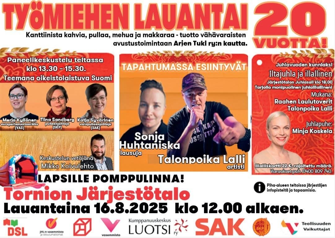 Vasemmistolaisten ja ay-voimien yhteinen tapahtuma täyttää nyt 20 vuotta. Tervetuloa Työmiehen lauantaihin Tornion Järjestötalolle lauantaina 16.8. klo 12 alkaen! DSL:n opintokeskus on yksi tapahtuman järjestäjistä.